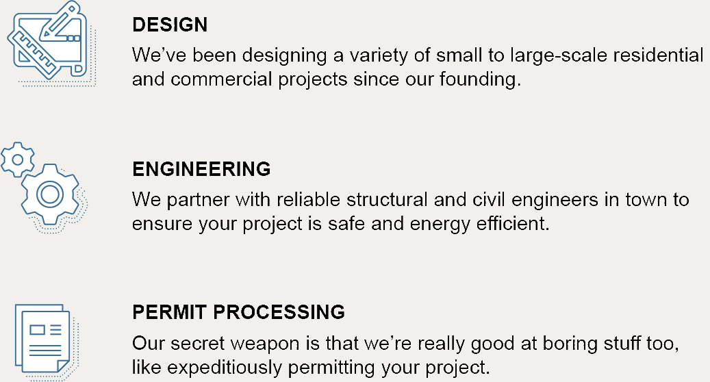 Every project presents a diverse set of challenges and opportunities. No matter the project size or budget, SA Designs is dedicated to providing the service, value, and innovation that our clients expect. The following is a list of services SA Design provides for residential and commercial projects.